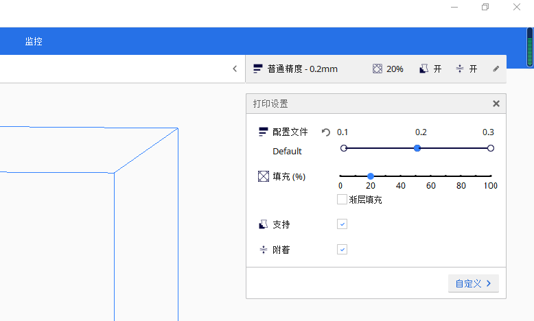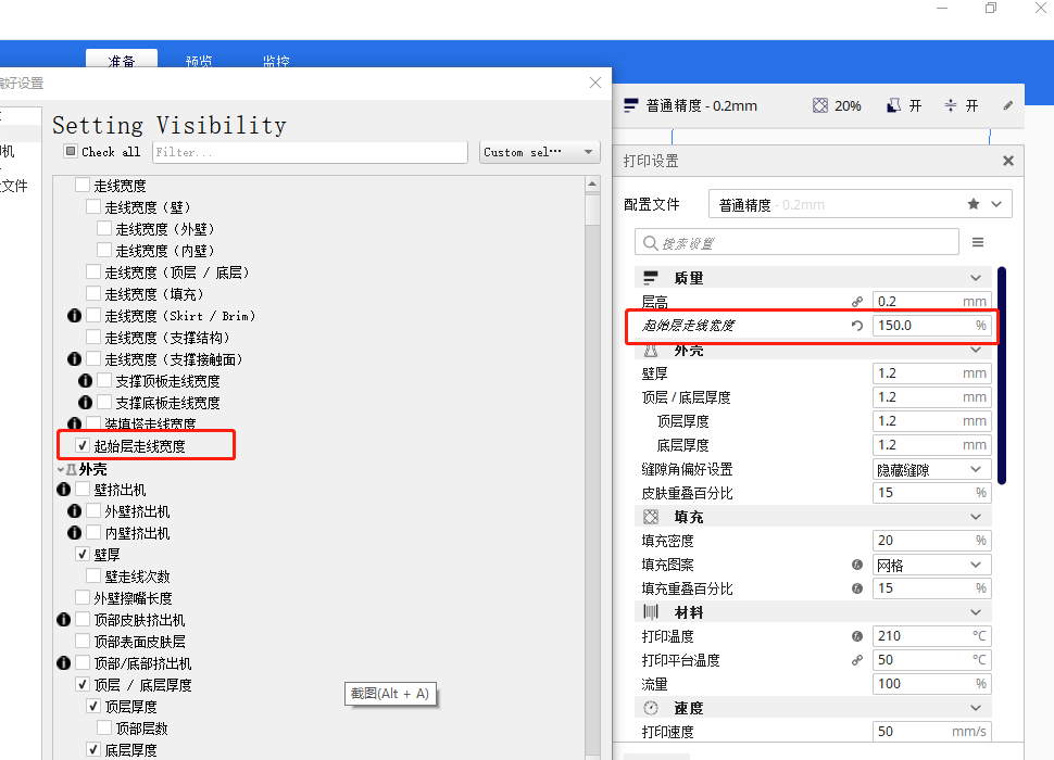 可對于起始層走線寬度進(jìn)行修改,最高為150%比例,可提高起始層與熱床粘附的效果。