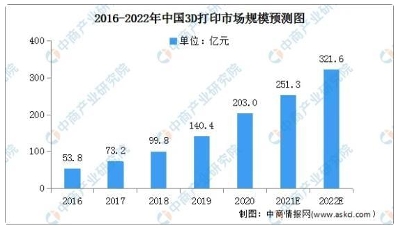 隨著政策的支持及企業的創新突破,我國3D打印產業有望獲得持續發展。據中商產業研究院預測,2022年我國3D打印市場規模有望增長至321.6億元。