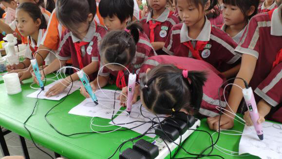 開幕式結束后,少先隊員們奔跑到各展位進行學習,極光爾沃展位人氣十足,少先隊員們對3D打印的模型很感興趣,不停的咨詢模型的打印時間和怎么打印出來,極光爾沃聽到這樣的問題非常開心,因為少先隊員們對3D打印十分感興趣,想從中了解更多3D打印知識,我們的李工組織分發耗材,為下午3D打印筆的體驗做好了準備。