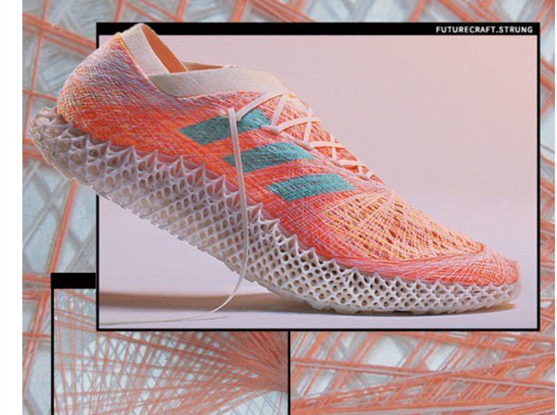 阿迪達斯發布了一則新款預告消息:高端鞋面制作技術strung,結合高端鞋中底光固化3D打印制作技術,打造出第一款數據編碼裝備,突破跑鞋極限,重塑未來。